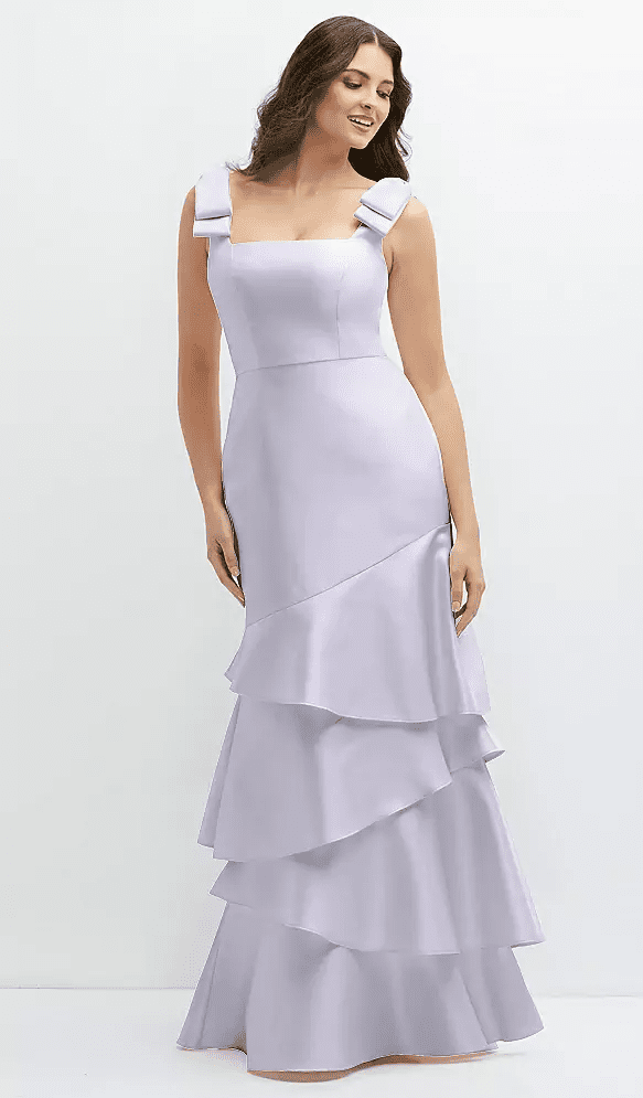 BOW-SHOULDER SATIN MAXI DRESS WITH ASYMMETRICAL TIERED SKIRT IN SILVER DOVE