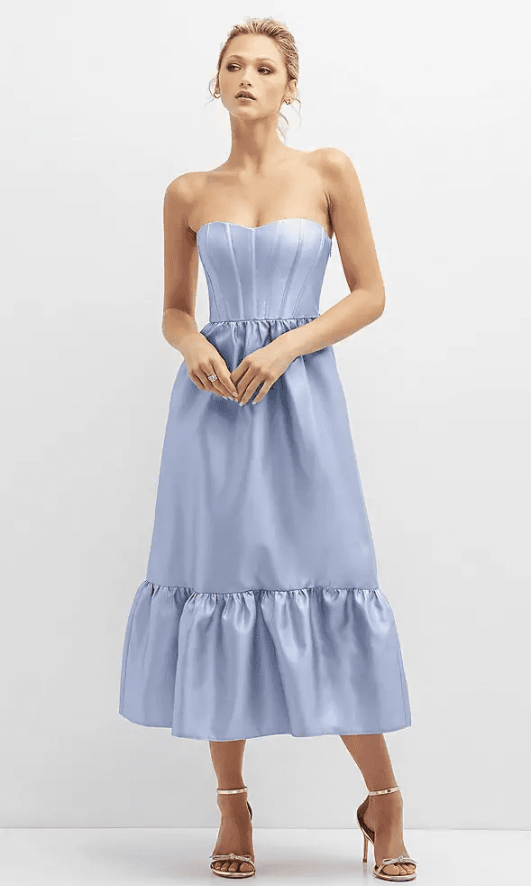 STRAPLESS SATIN MIDI CORSET DRESS WITH LACE-UP BACK & RUFFLE HEM IN SKY BLUE