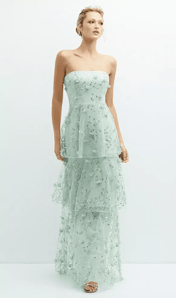 STRAPLESS 3D FLORAL EMBROIDERED DRESS WITH TIERED MAXI SKIRT IN CELADON