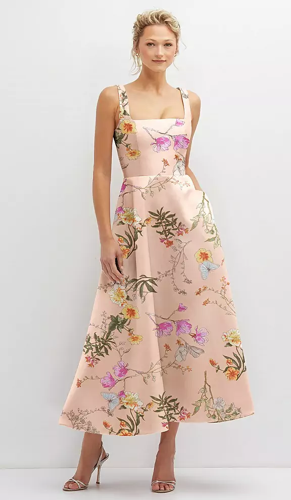 FLORAL SQUARE NECK SATIN MIDI DRESS WITH FULL SKIRT & POCKETS IN BUTTERFLY BOTANICA PINK SAND